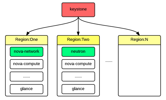 由于網(wǎng)易私有云需要部署在多個(gè)機(jī)房之中,每個(gè)機(jī)房之間在地理位置上自然隔離,這對(duì)上層的應(yīng)用來說是天然的容災(zāi)方法。另外,為了滿足私有云的功能和運(yùn)維需求,網(wǎng)易私有云需要同時(shí)支持兩種網(wǎng)絡(luò)模式:nova-network 和 neutron。針對(duì)這些需求,我們提出了一個(gè)面向企業(yè)級(jí)的多區(qū)域部署方案,如圖 2 所示。從整體上看,多個(gè)區(qū)域之間的部署相對(duì)獨(dú)立,但可通過內(nèi)網(wǎng)實(shí)現(xiàn)互通,每個(gè)區(qū)域中包括了一個(gè)完整的 OpenStack 部署,所以可以使用獨(dú)立的鏡像服務(wù)和獨(dú)立的網(wǎng)絡(luò)模式,例如區(qū)域 A 使用 nova-network,區(qū)域 B 使用 neutron,互不影響,另外為了實(shí)現(xiàn)用戶的單點(diǎn)登錄,區(qū)域之間共享了 keystone,區(qū)域的劃分依據(jù)主要是網(wǎng)絡(luò)模式和地理位置。