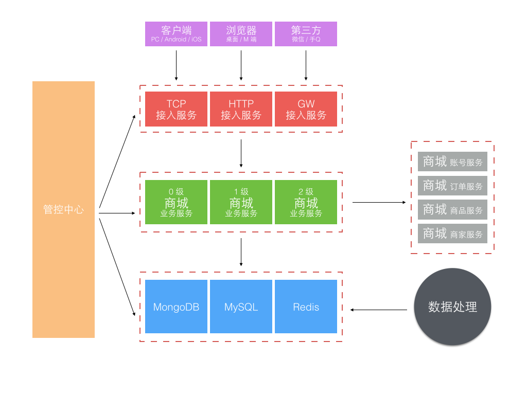 服務(wù)化的第一個(gè)問題如何把一個(gè)大的應(yīng)用系統(tǒng)切分成子服務(wù)系統(tǒng)。 當(dāng)時(shí)的背景是京東的部署還在半自動(dòng)化年代,自動(dòng)部署系統(tǒng)剛起步,子服務(wù)系統(tǒng)若按業(yè)務(wù)劃分太細(xì)太多,部署工作量很大且難管理。 所以當(dāng)時(shí)我們不是按業(yè)務(wù)功能分區(qū)服務(wù)的,而是按業(yè)務(wù)重要性級(jí)別劃分了 0、1、2 三個(gè)級(jí)別不同的子業(yè)務(wù)服務(wù)系統(tǒng)。 另外就是獨(dú)立了一組接入服務(wù),針對(duì)不同渠道和通信方式的接入端,見下圖。
