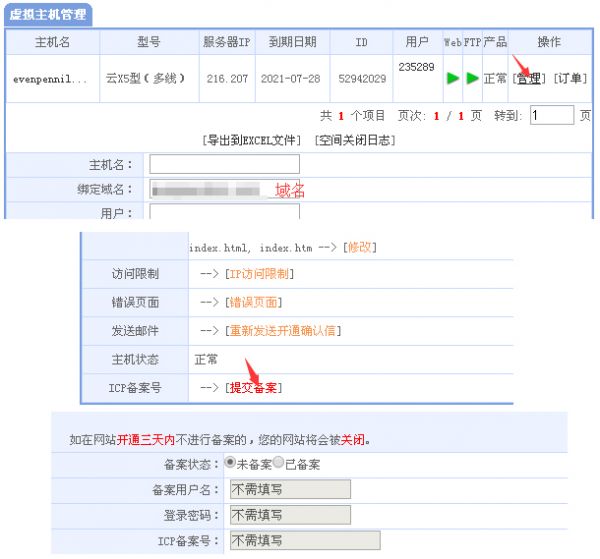 2、點(diǎn)擊管理,在管理界面點(diǎn)擊提交備案,可以看到網(wǎng)站的備案狀態(tài):