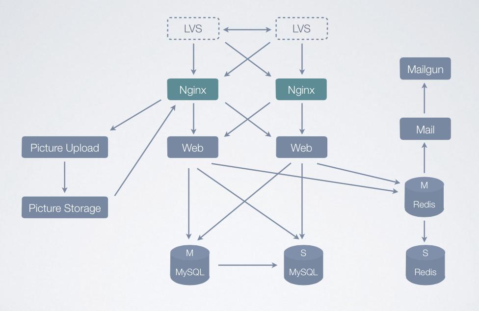這是當時那個階段的架構圖,Web和數據庫都做了主從。當時的圖片服務托管在又拍云上。 除了主從,為了性能更好還做了讀寫分離。為解決同步問題,又添加了一個服務器來跑離線腳本,避免對線上服務造成響應延遲。另外,為改進內網的吞吐量延遲, 還更換了設備,使整個內網的吞吐量翻了20倍。