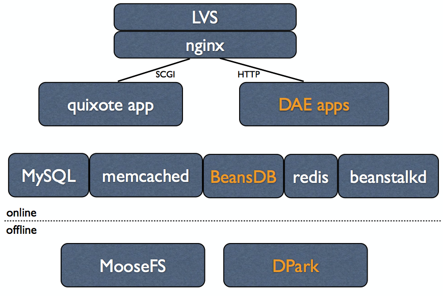 豆瓣整個(gè)基礎(chǔ)架構(gòu)可以粗略的分為在線和離線兩大塊。在線的部分和大部分網(wǎng)站類似:前面用LVS做HA,用Nginx做反向代理,形成負(fù)載均衡的一層;應(yīng)用層主要是做運(yùn)算,將運(yùn)算結(jié)果返回給前面的用戶,DAE平臺(tái)是這兩年建起來(lái)的,現(xiàn)在大部分豆瓣的應(yīng)用基本都跑在DAE上面了;應(yīng)用后面的基礎(chǔ)服務(wù)也跟其他網(wǎng)站差不多,MySQL、memcached、redis、beanstalkd,不一樣的是NoSQL的選擇——BeansDB,這是我們?cè)趲啄昵伴_(kāi)源的KV數(shù)據(jù)庫(kù),也是國(guó)內(nèi)比較早開(kāi)源的KV數(shù)據(jù)庫(kù)。