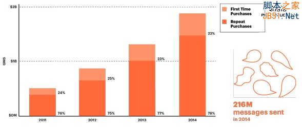 這個(gè)有機(jī)渠道的力量也被Etsy的重復(fù)購(gòu)買(mǎi)率證明了。Etsy的大部分商品銷(xiāo)售額都來(lái)自重復(fù)購(gòu)買(mǎi)(見(jiàn)下圖)。在2014年,重復(fù)購(gòu)買(mǎi)占到了商品銷(xiāo)售總額的78%,令人驚嘆。