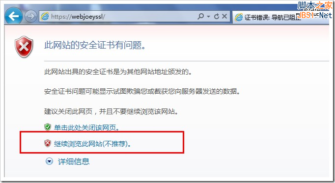 我們打開 http://webjoeyssl/ 或者是 https://webjoeyssl/ 會提示不安全,點擊繼續(xù)瀏覽即可。在實際的環(huán)境中,你拿到的是一個實際的證書,所以不會產生類似的報告安全證書有問題、