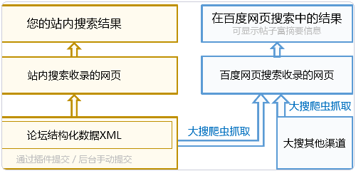 4、上圖是百度站內(nèi)搜索官方給出的影響機制圖。您在百度站內(nèi)搜索中提交的數(shù)據(jù)(包括通過插件提交或在后臺手動提交)除了被站內(nèi)搜索全部收錄外,還會提交給百度網(wǎng)頁搜索(即大搜索)進行抓取,也就是在大搜索常規(guī)的網(wǎng)頁發(fā)現(xiàn)渠道之外額外補充來自站內(nèi)搜索的渠道,從而提升大搜索對您站點的收錄情況。