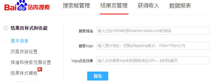 登錄站內(nèi)搜索后臺,選擇“結(jié)果頁管理”——>“結(jié)果頁樣式和功能” ——>“基本信息”,如下圖: