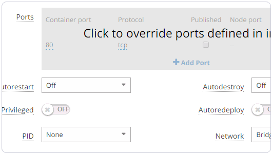 2、Ports中可以自己設(shè)置端口,默認(rèn)的tcp的80端口是開啟的,還有你可以選擇是否開啟自動(dòng)重啟、自動(dòng)部署應(yīng)用等等。