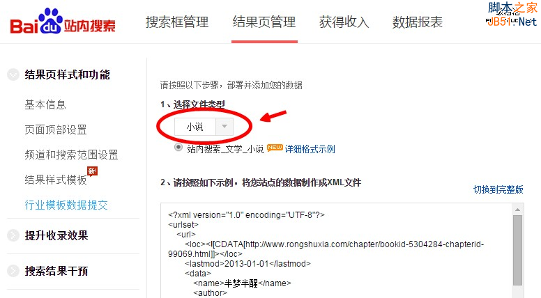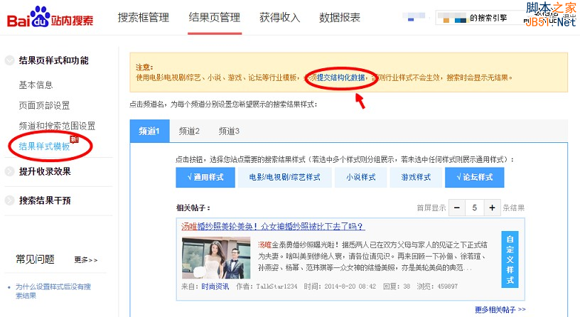 開通方法是:在百度站內(nèi)搜索后臺(tái)提交結(jié)構(gòu)化數(shù)據(jù),提交入口在“結(jié)果頁管理à結(jié)果樣式模板”頁面的最上方(下圖紅色箭頭位置):