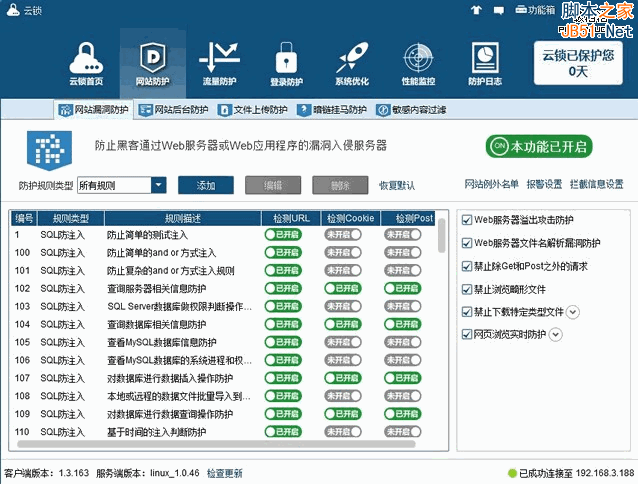 關(guān)于網(wǎng)站漏洞防護(hù),云鎖提供了非常全面的規(guī)則,這對(duì)于WEB服務(wù)器來說是相當(dāng)有幫助的,大家安裝后可仔細(xì)看下對(duì)應(yīng)的防護(hù)手段,這些規(guī)則支持自定義的,如果你對(duì)Linux 指令非常熟悉,這些規(guī)則支持正則表達(dá)式,這點(diǎn)來看非常專業(yè)。如果你發(fā)現(xiàn)開啟某些規(guī)則后網(wǎng)站訪問有異常,這時(shí)就需要手工來調(diào)整將某些防護(hù)項(xiàng)關(guān)閉了。至于網(wǎng)站后臺(tái)防護(hù)、文件上傳防護(hù)、暗鏈掛馬防護(hù)、敏感內(nèi)容過濾-相信大家一看就明白。