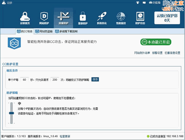 抗CC一直是云鎖的一大特色,在CC防護(hù)方面,云鎖Linux版繼承了Windows版的優(yōu)勢(shì),防護(hù)能力分為高中低三個(gè)級(jí)別,默認(rèn)是低,大家根據(jù)自己的需求去進(jìn)行改變。其他功能還在進(jìn)一步了解中,由于是內(nèi)測(cè)版,某些細(xì)節(jié)跟成熟的Windows版相比還有些差距。