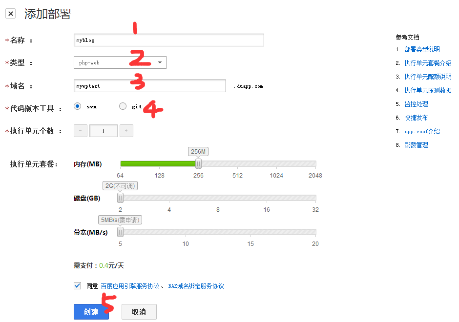 名稱依然隨便填寫,名稱和域名可以不相同,域名請(qǐng)好好填呢!類型請(qǐng)選擇“php-web”,代碼版本工具根據(jù)自己喜好選擇,這里就選擇“svn”,其它默認(rèn)即可(PS:下方需支付XX元請(qǐng)暫時(shí)無視,后面有說明。)