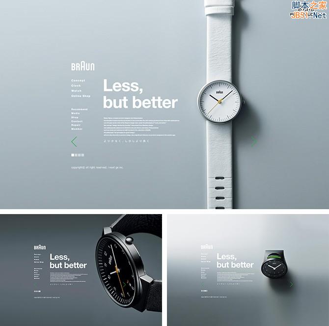例如:BRAUN博朗,整個(gè)頁面,簡(jiǎn)潔的圖片與文字的排版,讓視線非常集中,這樣用戶快速的將注意力集中到內(nèi)容上去,非常符合他們的主題“Less,but better”,給人留下回味、想象的空間。