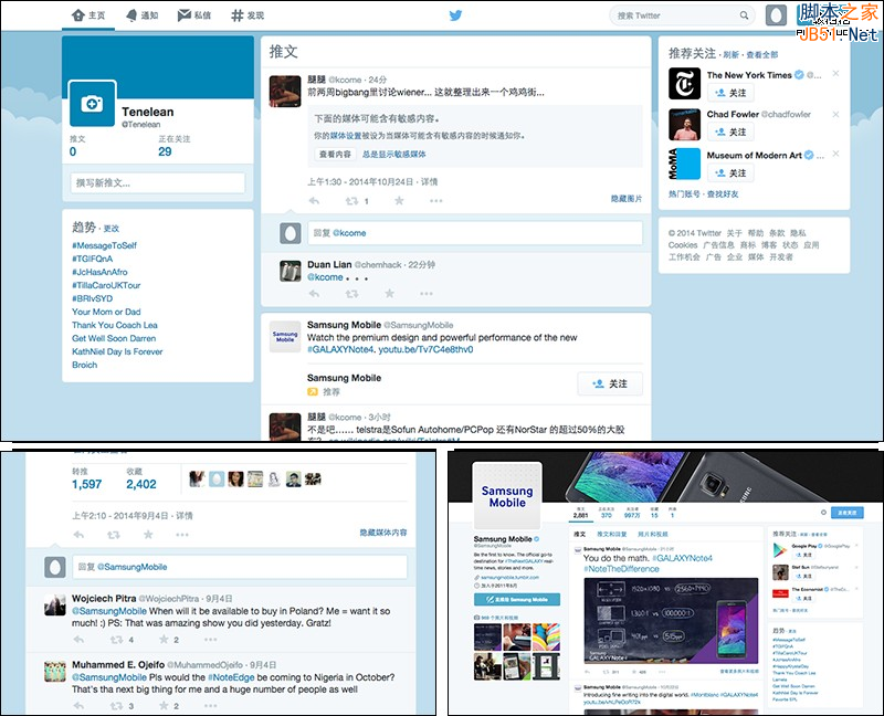 整體藍色設計帶來統(tǒng)一印象,顏色的深淺分別承載不同類型的內(nèi) 容信息,比如信息內(nèi)容模塊,白色底代表用戶內(nèi)容,淺藍色底代表回復內(nèi)容,更深一點的藍色底代表可回復操作,顏色主導著信息層次,也保持了twitter的品牌形象。