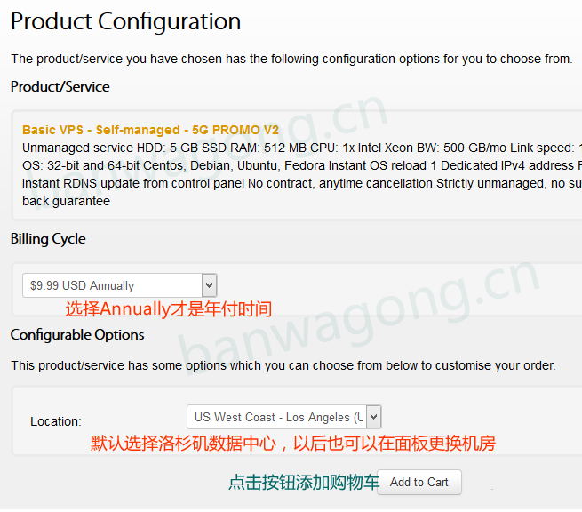 我們?nèi)缓髸?huì)看到上圖所示的界面,根據(jù)圖示我們需要確定選擇的方案以及時(shí)間,默認(rèn)是洛杉磯機(jī)房,我們也可以選擇其他的幾個(gè)機(jī)房之一,點(diǎn)擊"ADD TO CART"添加購物車。