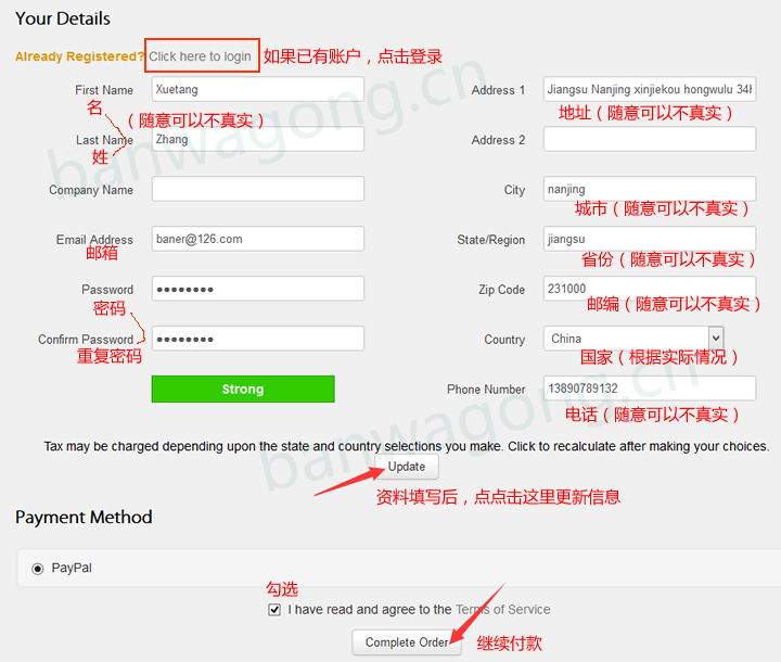 根據(jù)上圖,如果我們有過賬戶,可以直接點(diǎn)擊"Click here to login"登錄以及付款就可以,如果還沒有賬戶則需要注冊(cè)賬戶。個(gè)人信息不要真實(shí)的,但也不能太離譜和亂寫字符出來,好歹也要稍微用點(diǎn)拼音。