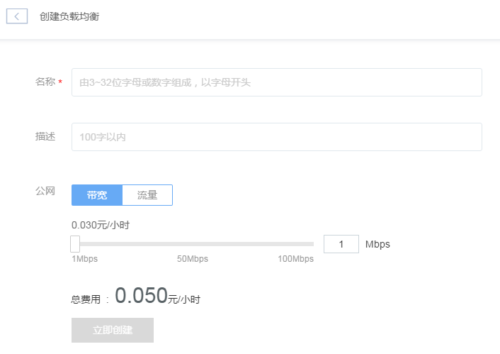 點擊左側(cè)的導(dǎo)航菜單「負(fù)載均衡」,進入負(fù)載均衡實例列表頁,點擊「創(chuàng)建負(fù)載均衡」按鈕,進入負(fù)載均衡創(chuàng)建界面,如下圖所示: