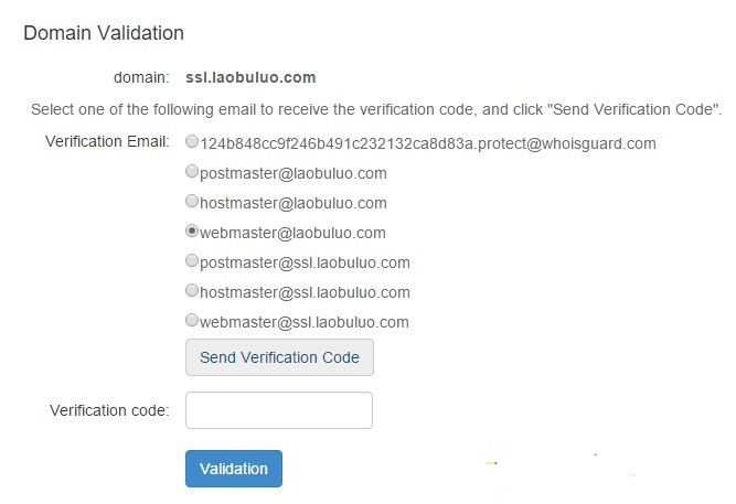 這里我們選擇一個(gè)可以用的郵箱然后點(diǎn)擊Send Verification Code按鈕發(fā)送郵件,然后收到的激活碼輸入后點(diǎn)擊Validation按鈕驗(yàn)證。這里需要注意的,如果我們沒(méi)有域名郵局,會(huì)自動(dòng)檢索WHOIS郵箱,如果我們有隱私保護(hù)的,那可以先取消,等接受到后再開(kāi)啟隱私保護(hù)。這里我用的是"webmaster@laobuluo.com"域名郵局,所以選擇后接受驗(yàn)證。