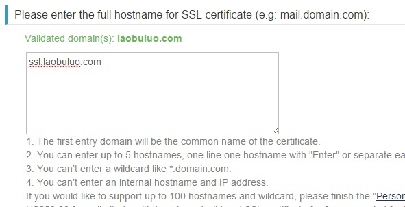 我們可以最多填寫包含"laobuluo.com"5個(gè)子域名,一行一個(gè),StartSSL免費(fèi)SSL只能支持5個(gè),如果需要多個(gè),那就需要購(gòu)買付費(fèi)服務(wù)。