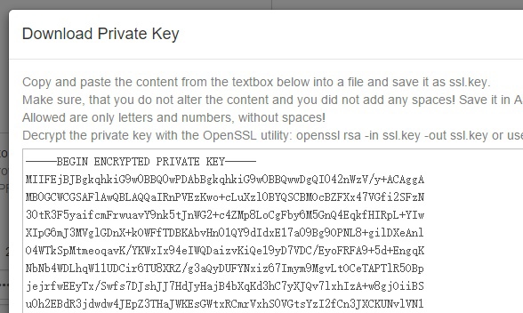 按照StartSSL的文檔一步步的來(lái)。不過(guò)我是直接選擇在 https://startssl.com/Certificates 中設(shè)置「Certificate Signing Request (CSR)」>「Generated by PKI system」,又因?yàn)樵诰€生成證書這一步必須得輸入密碼,所以導(dǎo)致下面的問(wèn)題(上傳自己在服務(wù)器上生成的證書可能不會(huì)碰到這個(gè)問(wèn)題):