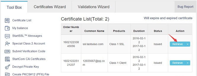 我們可以看到StartSSL證書后臺(tái)還是比較清晰的,一般的工具我們不需要用到,如果后面小編在實(shí)際用途的時(shí)候需要用到在補(bǔ)充。這里我們需要做的就是將證書下載下來(lái)。默認(rèn)是免費(fèi)1年,到期之前是可以續(xù)約的,也是免費(fèi)的。
