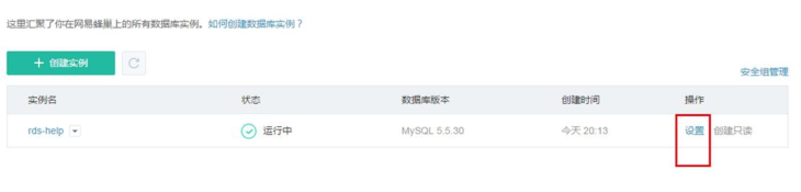 1.在數(shù)據(jù)庫的主界面,點擊該實例在「操作」列的「設置」鏈接,如下圖所示: