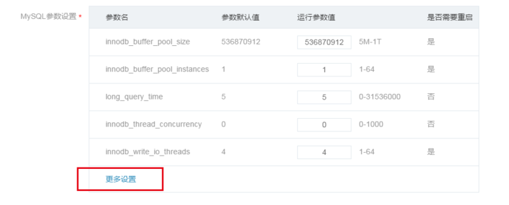 在參數(shù)組設置中,你可以修改數(shù)據(jù)庫的配置。頁面中只顯示用戶最常修改的參數(shù),要查看和修改更多的參數(shù),點擊「更多設置」即可。