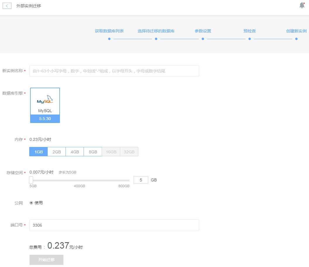 系統(tǒng)預檢查無誤后,顯示如下「創(chuàng)建新實例」頁面,即可進行數(shù)據(jù)遷移,此時只需填寫新實例名稱,選擇合適的內(nèi)存及存儲空間后,點擊「開始遷移」即可,數(shù)據(jù)庫列表會自動生成遷移的數(shù)據(jù)庫實例。
