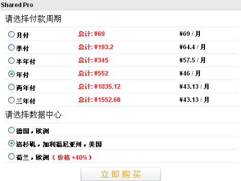 第四步,我選擇PRO無限方案,洛杉磯機房(根據自己的需要選擇),然后點擊"立即購買"。