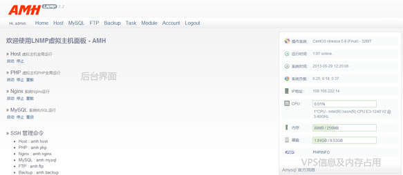 這篇的簡(jiǎn)單介紹AMH面板就這樣,后面我會(huì)實(shí)戰(zhàn)與大家分享使用,安裝常規(guī)的CMS站點(diǎn)。需要說(shuō)明一下,開(kāi)始在安裝的時(shí)候我用的是一款免費(fèi)的1G內(nèi)存方案的VPS,機(jī)房速度不是太好,后來(lái)我換成目前的一款在洛杉磯的機(jī)器,速度好一些。測(cè)試機(jī)器是256M內(nèi)存的,不要到時(shí)候朋友看到前面的機(jī)器IP信息和后面不同,不要認(rèn)為是虛假的教程,教程是完整的。