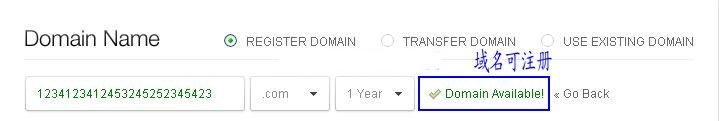 4、如果新注冊域名,在域名輸入框里輸入域名后點擊check按鈕,檢查是否可以注冊。如果可以注冊,系統(tǒng)顯示Domain available。如果用已經(jīng)注冊的域名,則直接輸入域名即可。