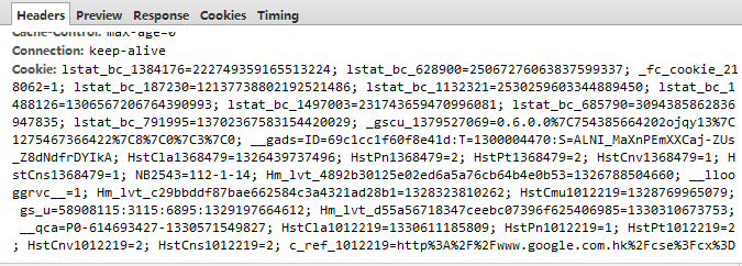 由于修改這兩個設置需要重啟IIS(net stop http, net start http, iisreset),并且只是表面上解決問題,所以我們沒有立即采取這個方法。又回過頭來在Chrome中查看請求頭,突然發(fā)現(xiàn)cookie的值好長。