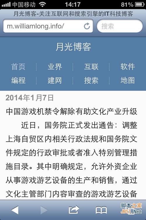 對于網(wǎng)站的修改來說,只要在HTML頭部增加viewport標(biāo)簽(控制顯示尺寸、是否允許縮放、初始比例、上下限等)、 MobileOptimized標(biāo)簽(微軟為IE Mobile版設(shè)置的定義寬度標(biāo)記)和HandheldFriendly標(biāo)簽(是否對手持設(shè)備友好,只有true或者false),在CSS文件尾部增加針對不同屏幕分辨率的規(guī)則,布局寬度使用相對寬度,隱藏側(cè)欄,半小時(shí)的開發(fā)量就可以提升網(wǎng)站的手機(jī)移動(dòng)瀏覽體驗(yàn)。下圖是一個(gè)樣例,利用自適應(yīng)網(wǎng)頁設(shè)計(jì)技術(shù)來建立的月光博客移動(dòng)網(wǎng)站。