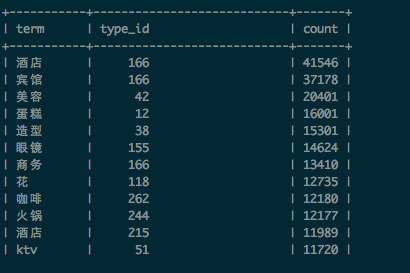 在產(chǎn)生粗糙字典集合時(shí),我們還統(tǒng)計(jì)了校準(zhǔn)POI中,每個(gè)品類(type_id),以及特征詞(term)在品類(type_id)出現(xiàn)的次數(shù)(文檔頻率)。分別寫入到表category_frequency和term_category_frequency,表的部分結(jié)果如下: