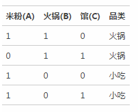 信息增益得分衡量了該特征的重要性。假設(shè)我們有四個(gè)樣本,樣本的特征詞包括“火鍋”、“米粉”、“館”,我們采用信息增益判斷不同特征對(duì)于決策影響: