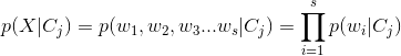 已知類別的條件下,多項(xiàng)事件模型假設(shè)樣本的產(chǎn)生過程:對(duì)文本中第k個(gè)位置的單詞,從字典中選擇一個(gè)單詞,每個(gè)位置k產(chǎn)生單詞對(duì)應(yīng)于一次多項(xiàng)事件。樣本X=(w1,w2...ws)的類概率密度: