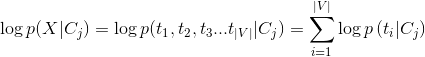 已知類別的條件下,多項(xiàng)伯努利對(duì)應(yīng)樣本生X成過程:遍歷字典中的每個(gè)單詞(t1,t2...t|V|),判斷這個(gè)詞是否在樣本中出現(xiàn)。每次遍歷都是一次伯努利實(shí)驗(yàn),|V|次遍歷: