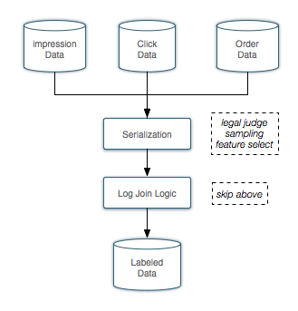 數(shù)據(jù)序列化之后在HDFS上保存三份文本文件,分別是曝光(Impression)、點(diǎn)擊(Click)和下單(Order)。數(shù)據(jù)標(biāo)注模塊根據(jù)globalid(一次搜索的全局唯一標(biāo)示,類似于sessionid)和相應(yīng)的團(tuán)購id為key,將曝光、點(diǎn)擊和下單關(guān)聯(lián)起來,最終生成一份標(biāo)注好是否被點(diǎn)擊、下單、支付的標(biāo)注數(shù)據(jù)。同時這份標(biāo)注數(shù)據(jù)攜帶了本次展現(xiàn)的詳細(xì)特征信息。