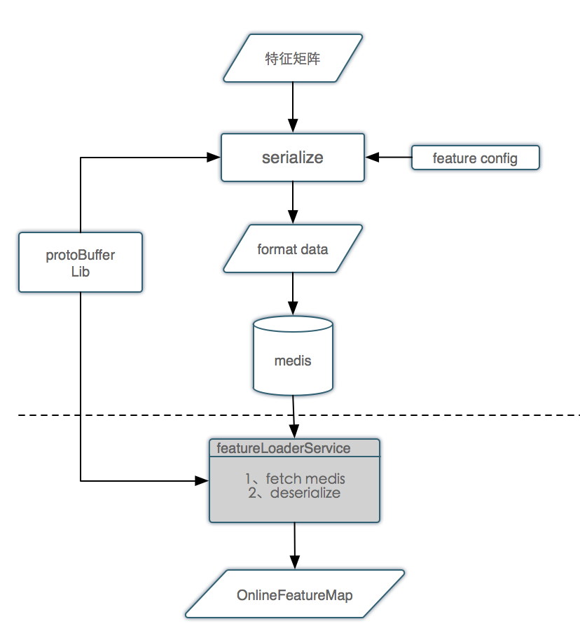 序列化模塊通過特征配置文件從特征矩陣抽取需要的特征,調(diào)用protoBuffer Lib將特征封裝成protoBuffer的格式,寫入Medis。