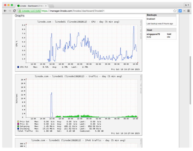 Linode 也有提供簡單的 CPU 使用量、網(wǎng)絡(luò)流量與硬盤 IO 的統(tǒng)計圖,這些圖是 Linode 自動產(chǎn)生的,不會影響到主機(jī)的運(yùn)作,當(dāng)然也不需要安裝。