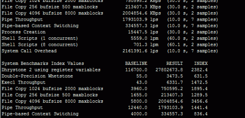 3、用經典的Linux VPS主機性能跑分工具Unixbench 5.1.2測試,256MB內存的VPS最后得分超過了1000。