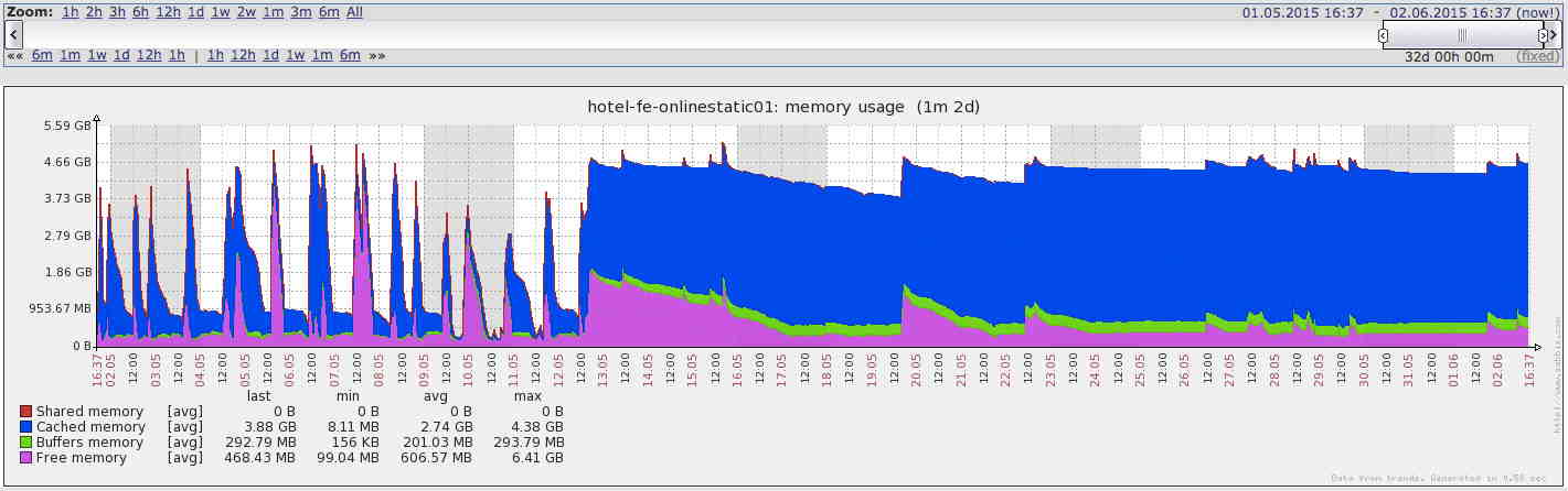 以下是我們?cè)谏a(chǎn)環(huán)境遭遇的一個(gè)案例:最近發(fā)現(xiàn)線上服務(wù)的內(nèi)存占用在服務(wù)重啟后會(huì)呈線性的增長(zhǎng),進(jìn)程啟動(dòng)18小時(shí)后,內(nèi)存就已經(jīng)占用接近1.6G左右,之后不久便會(huì)超過V8的內(nèi)存限制導(dǎo)致服務(wù)重啟。從圖中可以看出,在修復(fù)之前內(nèi)存使用情況一直在隨時(shí)間進(jìn)行周期性的波動(dòng),波動(dòng)的原因就是線上Node進(jìn)程不斷的重啟導(dǎo)致的。