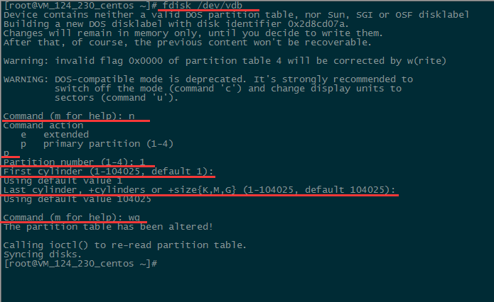 按照界面的提示,依次輸入“n”(新建分區(qū))、“p”(新建擴展分區(qū))、“1”(使用第1個主分區(qū)),兩次回車(使用默認配置),輸入“w”(保存分區(qū)表),開始分區(qū)。
