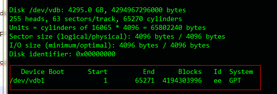 3、分區(qū)創(chuàng)建完成后,可以使用fdisk –l查看到新分區(qū)信息