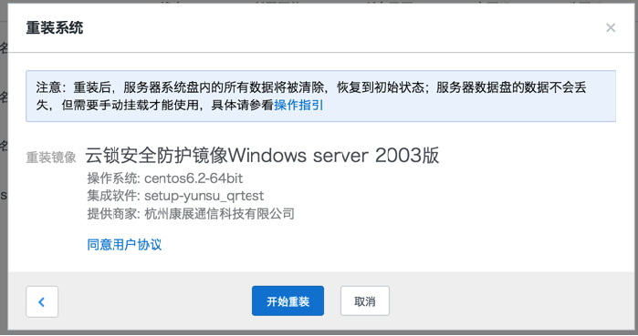 注意:重裝后,服務(wù)器系統(tǒng)盤(pán)內(nèi)的所有數(shù)據(jù)將被清除,恢復(fù)到初始狀態(tài);服務(wù)器數(shù)據(jù)盤(pán)的數(shù)據(jù)不會(huì)丟失,但需要手動(dòng)掛載才能使用,具體請(qǐng)參看操作指引