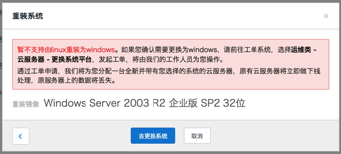針對(duì)以上這些情況,我們提供Linux與Windows互換的能力。如果一臺(tái)Linux云服務(wù)器選擇了重裝了Windows系統(tǒng),將看到如下提示: