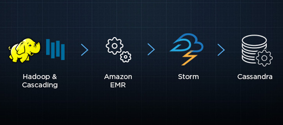 Twitter使用Cascading框架編寫、Amazon EMR執(zhí)行MapReduce程序。 Amazon EMR將Twitter存儲(chǔ)到S3上的數(shù)據(jù)作為輸入,處理完畢后,再將結(jié)果存入S3。Twitter通過運(yùn)行在Storm上的調(diào)度topology來探測程序執(zhí)行完畢,并將結(jié)果灌入Cassandra集群,這樣結(jié)果就能用于亞秒級(jí)查詢API。