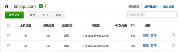 添加好域名后,可以點擊域名進入DNS解析設(shè)置,這時可以看到DNSPOD已經(jīng)為這個域名設(shè)置了NS (NameServer)記錄。