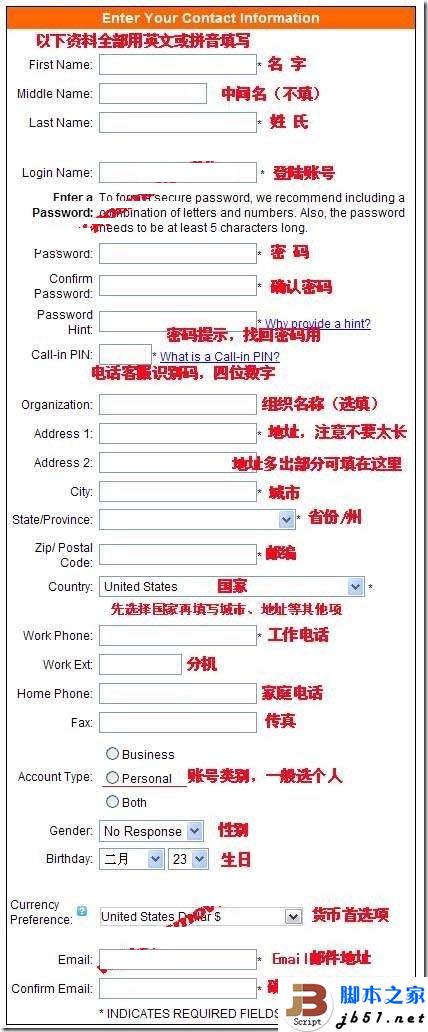2、進(jìn)入帳號(hào)資料填寫頁(yè)面,按照下圖的字段填寫.