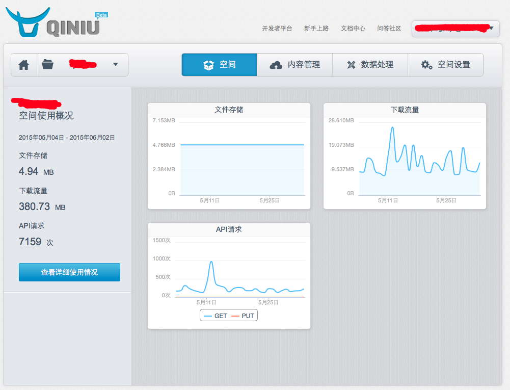 下圖是七牛云的后臺,用戶的管理單元是空間,文件存儲在空間下: