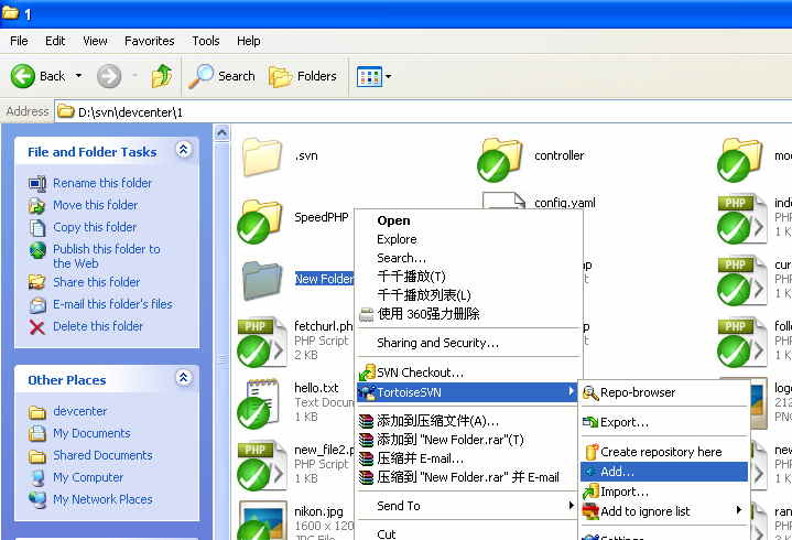 在SVN工作目錄下,對于文件修改,完成后只需要commit就ok了,但對于新增文件,或者從其它目錄復制進來的文件或文件夾,需要在commit之前需 要做一步add操作,即將文件或文件夾添加到svn工作目錄中來,否則SVN客戶端不認它。具體操作很簡單,如圖: