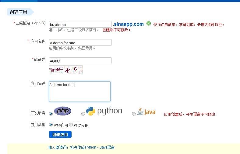 在注冊完賬號之后,需要到 http://sae.sina.com.cn/?m=myapp&a=create創(chuàng)建一個應用。